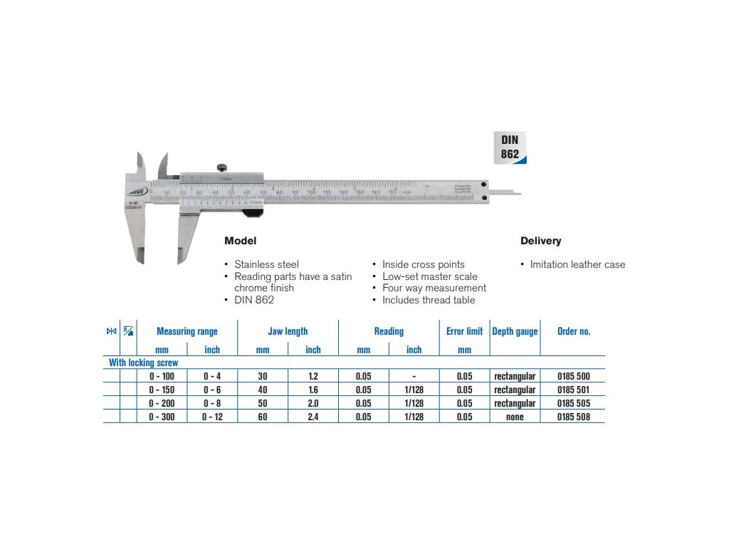 - Plochý hloubkoměr u rozsahu 150 a 200 mm, Posuvka 300 mm bez hloubkoměru.