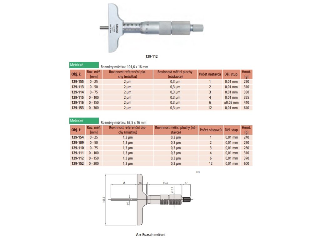 129-153 Mikrometrický hloubkoměr 0-300/0,01 mm, s výměnnými nástavci, Mitutoyo