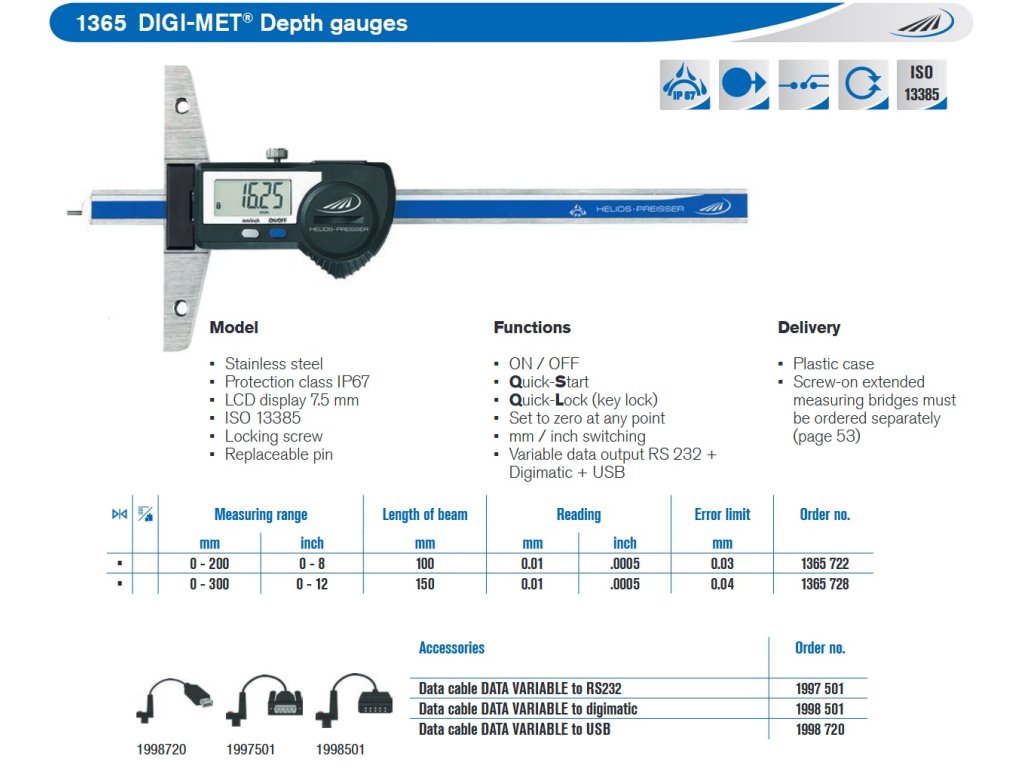 1365728 Digitální posuvný hloubkoměr 0-300 mm, IP67, s jehlou, výstup dat, Helios - Preisser